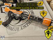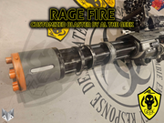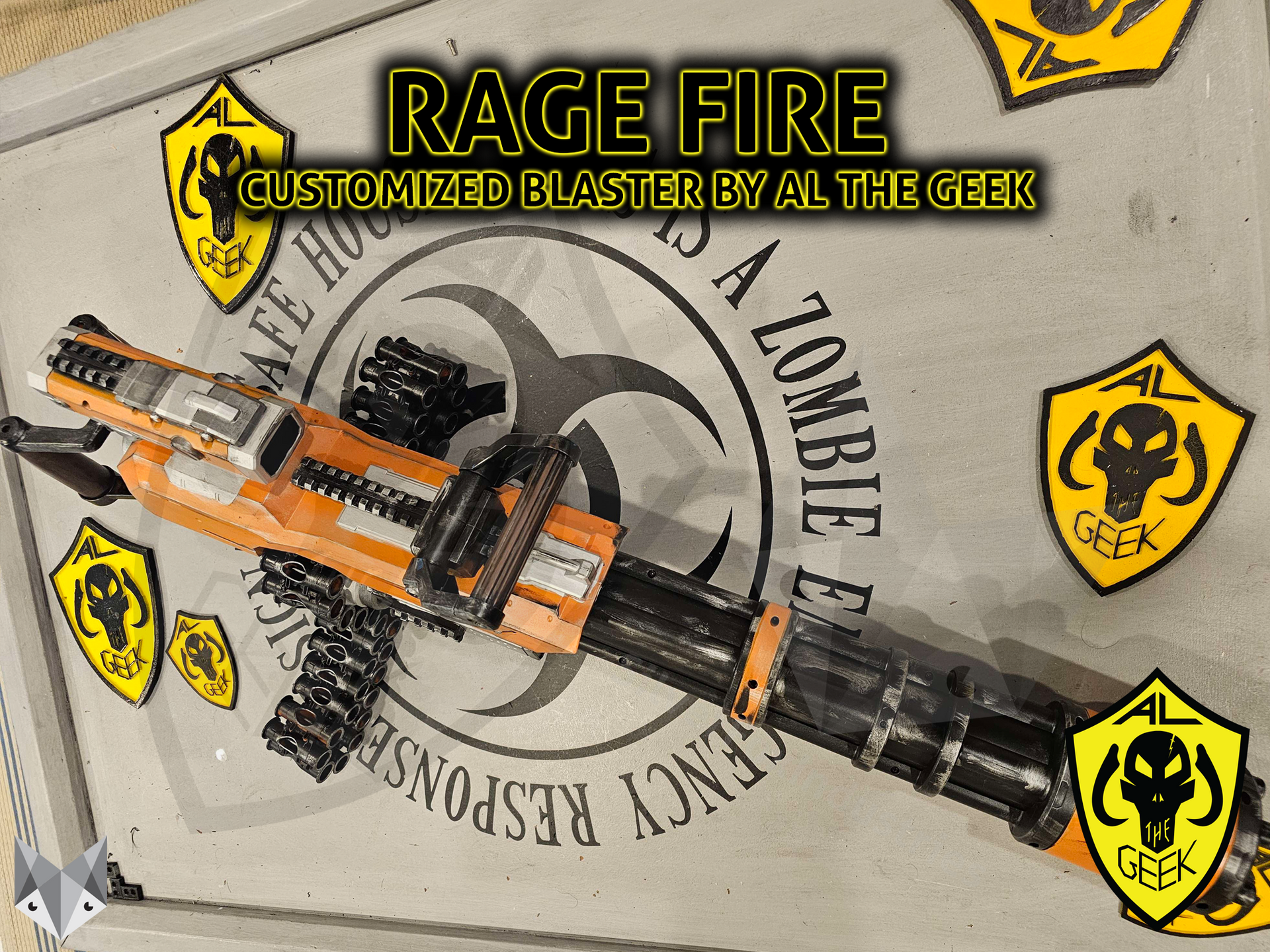 This is a customized X-Shot Rage Fire Minigun. It is a battery operated, belt fed dart blaster. It takes 6 AA batteries and boasts a 100 FPS fire rating. It shoots full size darts that are included with your order. It also comes with an adjustable tripod and usable scope. It is available in various colors upon request and detailed in a post-apocalyptic theme that is both functional and great as a cosplay accessory. The blaster is then finished with 3 coats of clear varnish to make a durable finish.