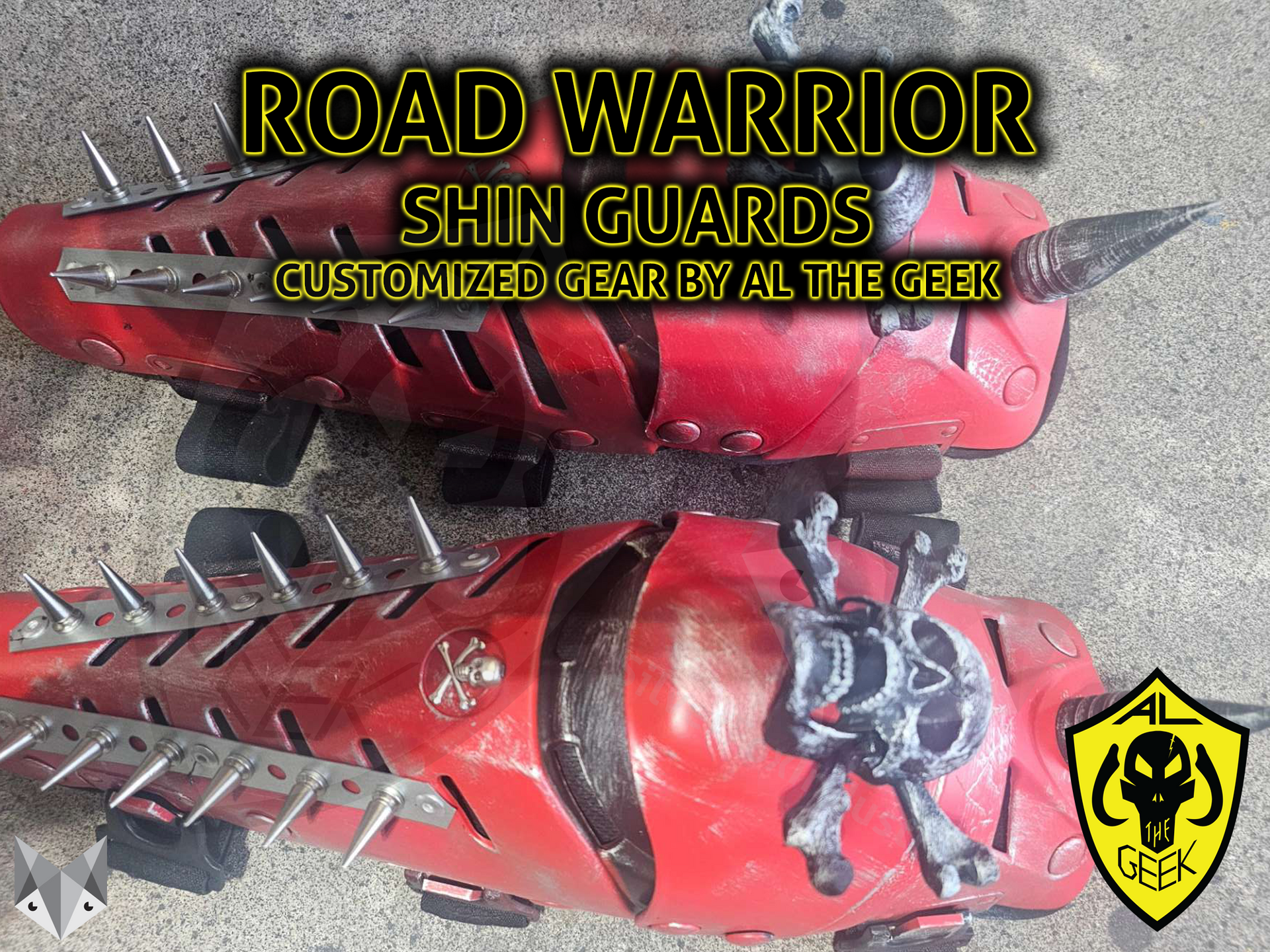 This is a custom set of shin guards That has been done in a post-apocalyptic theme. They are adjustable straps, and the skulls and spikes have been glued and screwed on. Great for cosplay and your costume needs. It comes in a variety of colors and is made of durable plastic.