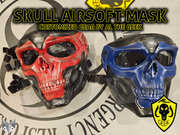 This is a custom painted airsoft skull mask. It is fully adjustable with 6 different straps to ensure a secure fit. The entire mask is rated for airsoft and made of high impact plastic. It is great for play but also great for cosplay and costumes. It is custom painted and comes in various colors. The mask is then sealed with 3 coats of clear to ensure a durable finish.