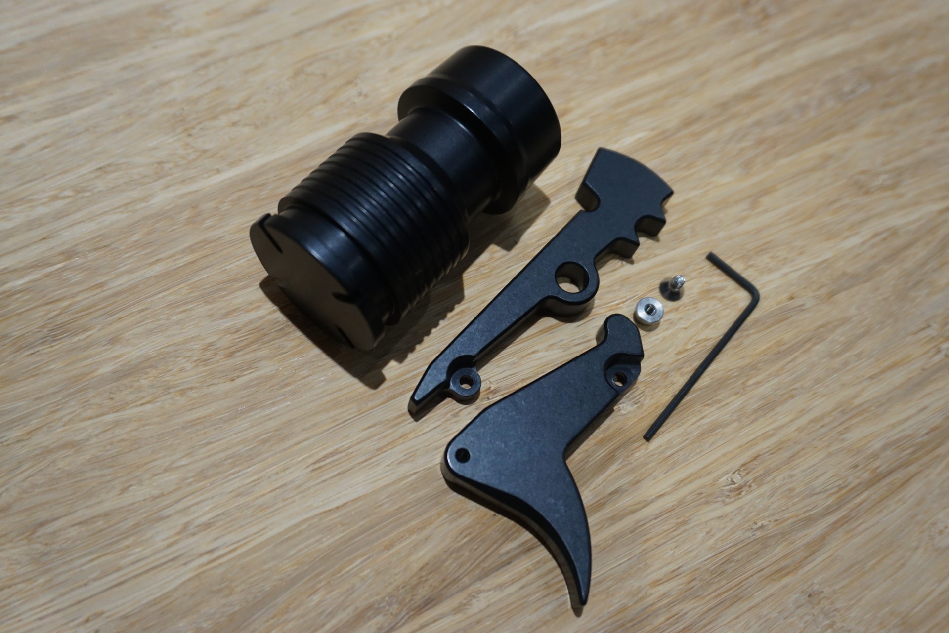 The Tooth & Nail Mini from Drac. This version of his popular Caliburn parts are made specifically for the Talon Claw platform. Made from machined and anodized aluminum. Not only are these parts beautiful, but they change the sound profile of your blaster to be incredibly satisfying, and it makes priming even smoother.