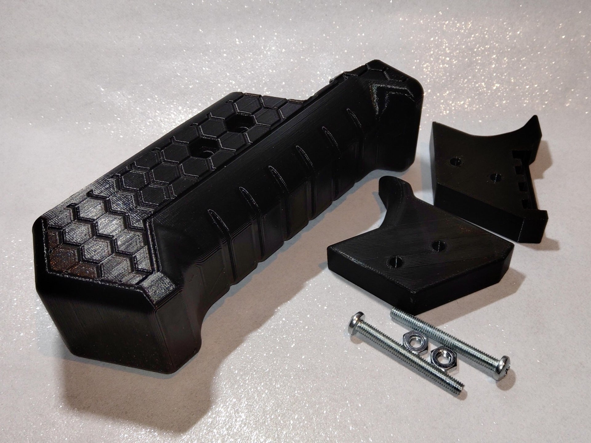 This is a foregrip for the Nerf Rival Perses. The grip extends up past the bottom lip of the front of the blaster and it is at the same angle and about 3/4 the length of the battery tray section, so it provides plenty of room for your hand and feels quite comfortable and natural to hold. I designed it to assemble in three pieces, two smaller "core" pieces that clamp over the Nerf Rival rail on the front of the blaster, and the grip itself, which just slides over the core. I wanted this thing to be rock solid, which means the tolerances are quite tight and it may require a little bit of effort to get the grip in place, however this means it will not wiggle around at all. Once in place, insert the 2 screws through one side (does not matter which) and place the 2 hex nuts in the other side. Use a philips screwdriver to thread the screws into the nuts. Do not overtighten.