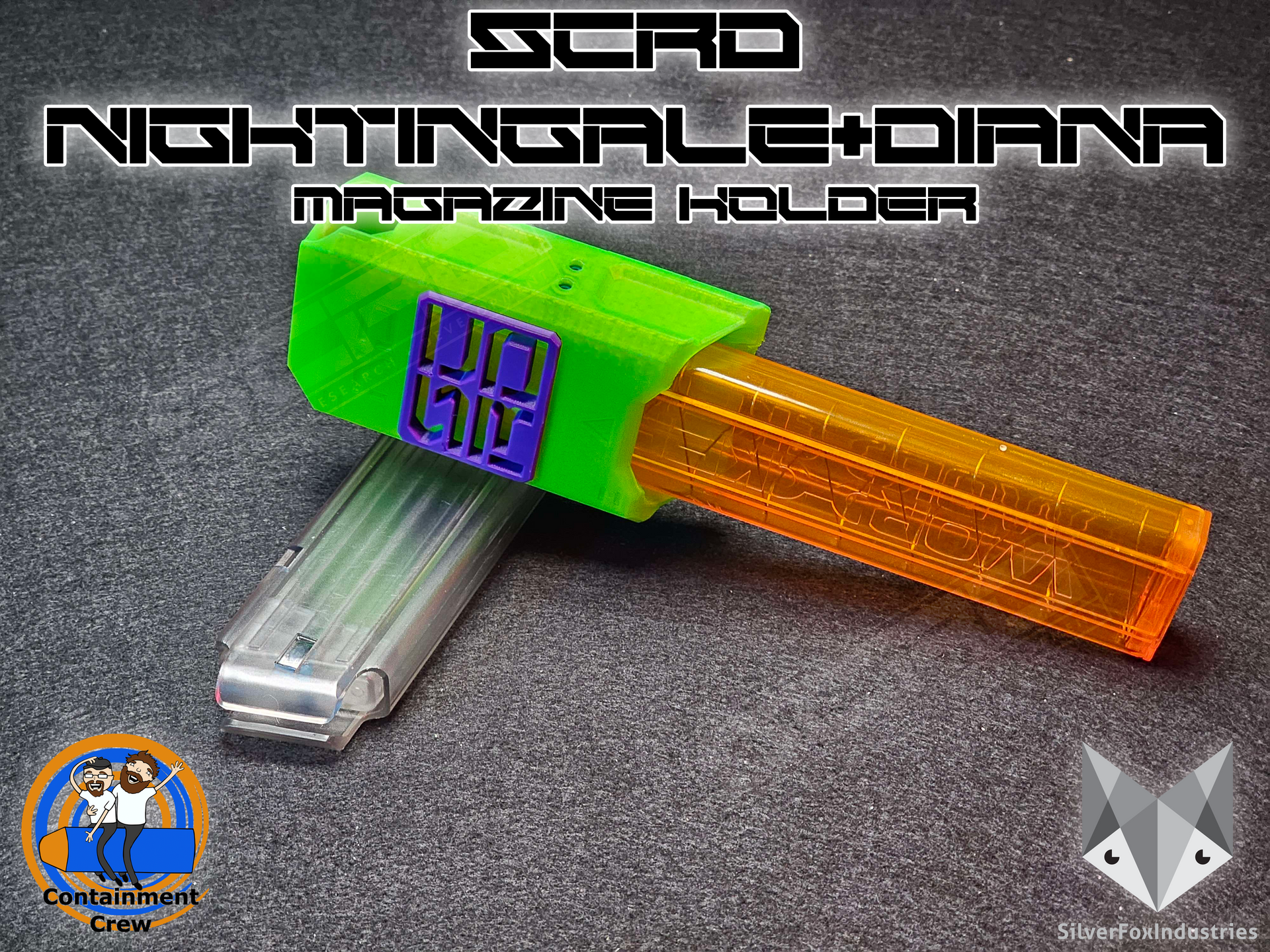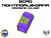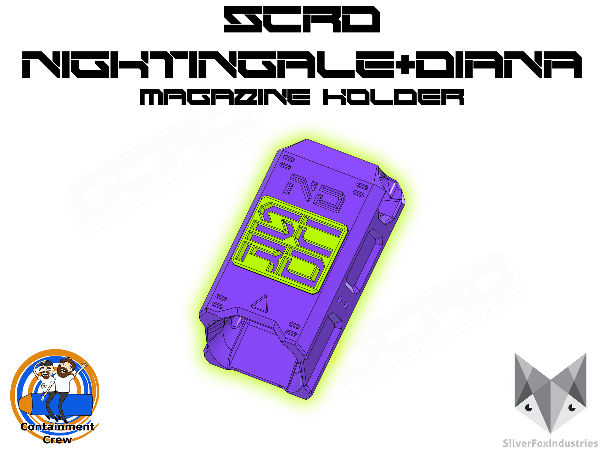 Designed by Ryan of SFI, the SCRD Mag Holder is 3D Printed, compatible with Nightingale and Diana Magazines (and possibly magazines with similar geometry), can be loaded with the magazine facing either direction with the use of 6 POM Ball Plunger Detents, and features the ability to top the magazines off while in the mag holder itself.
