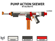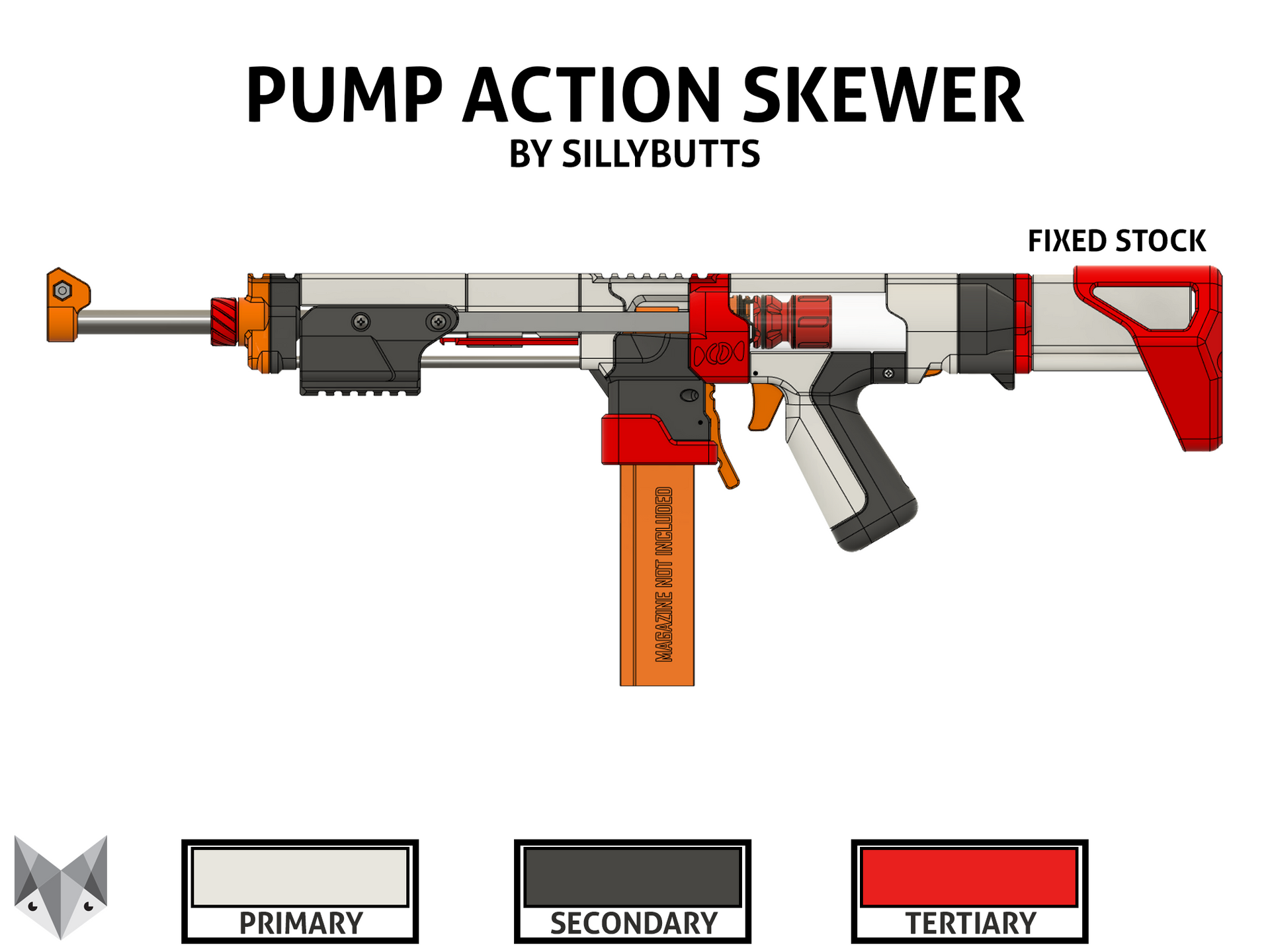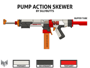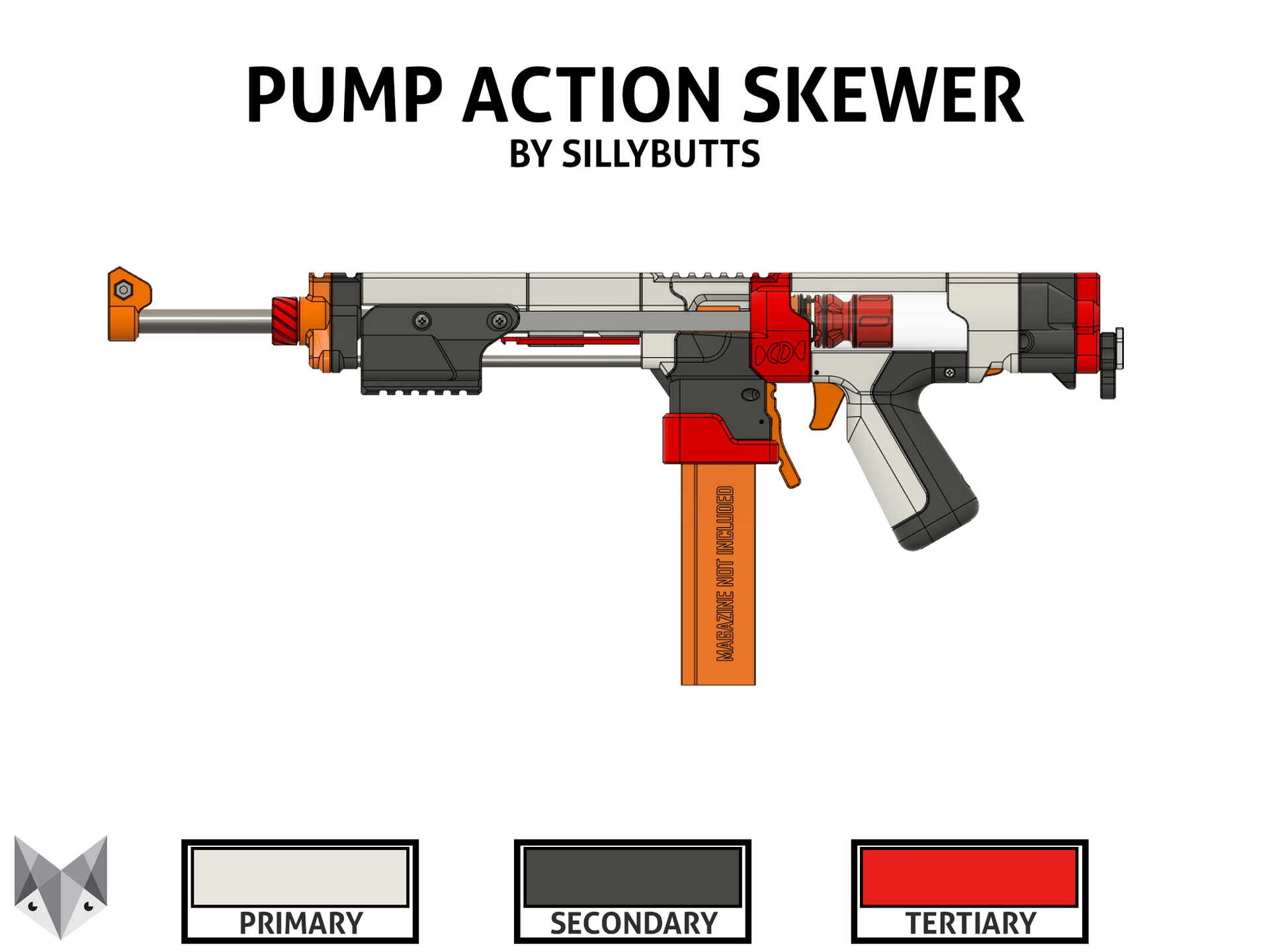 What started as a meme, but became reality. Sillybutts remixed the SKEWER by Charamile Designs to make it into a pump action blaster, not unlike the Talon Claw by Captain Slug.