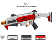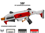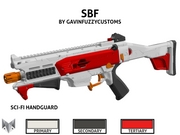 SBF stands for: SPAMF But Flywheel. However, at this point, the naming convention is just tradition. This blaster really doesn't have much, if anything, in common with the original SPAMF itself.