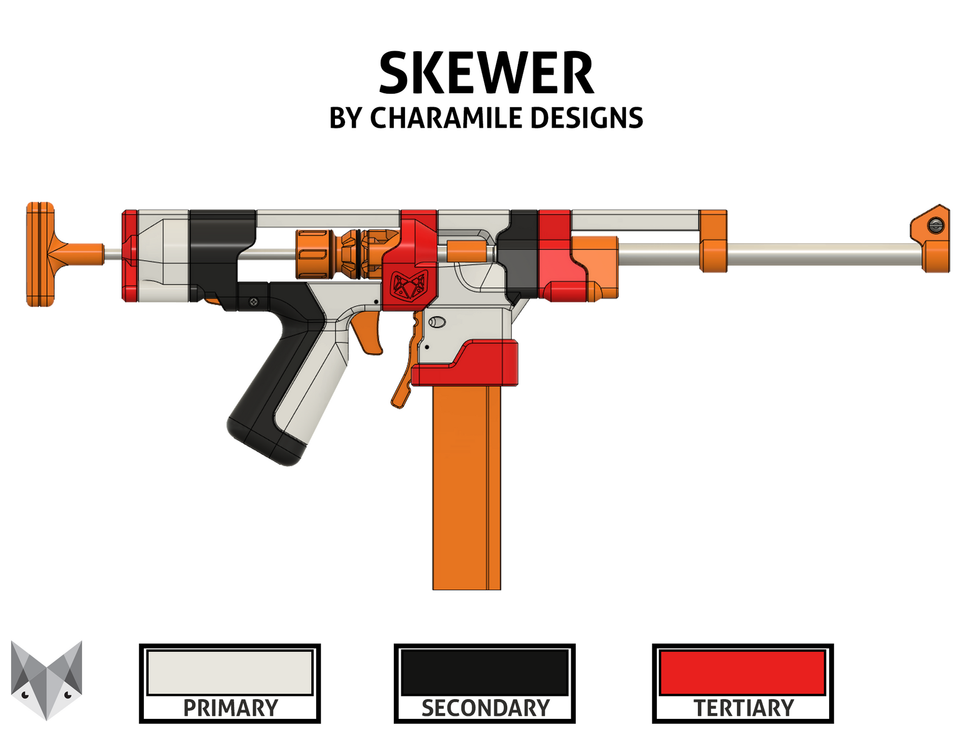 The Skewer is a 3.5" draw T-pull springer inspired by an old prototype from Orion Blasters and designed by Taffy of Charamile Designs.