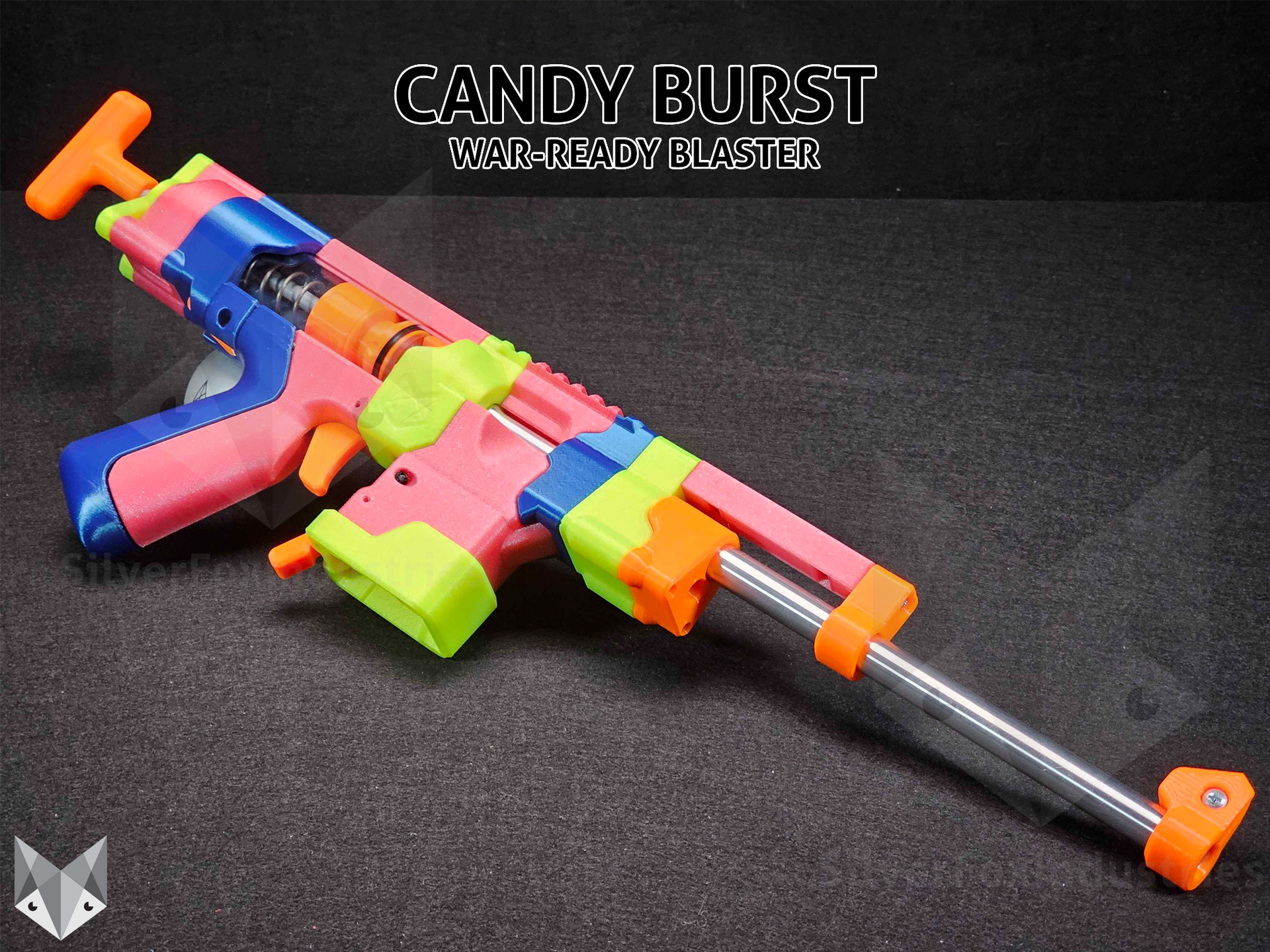 This War Ready Skewer we are calling the "Candy Burst" is a Fully Assembled and tested blaster that is ready to ship. It is built from various PLA filaments from both Atomic Filament and Proto Pasta. This blaster features an SF25-TC spring, and a 30cm 13" ID Chambered Kuryaka barrel.
