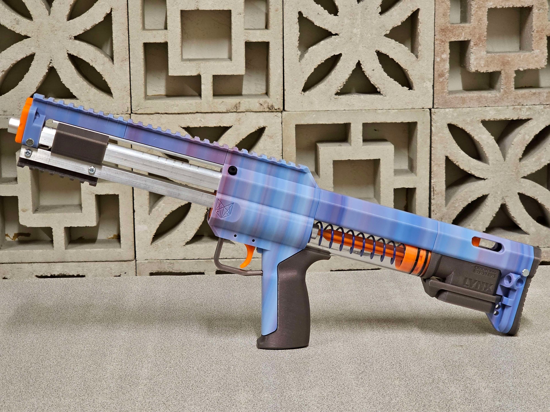 This War Ready Lynx we are calling "Sugar Clouds", is a Fully Assembled and tested Lynx printed in Proto-Pasta Nebula Cotton Candy Pastel Multicolor HTPLA, Atomic Filament Translucent Smoke Black, and Atomic Filament Neon UV Reactive Orange. Features an SF25-TC Spring in Purple, PC Catch, and an 18" barrel. Best of all, as with all of our War Ready Blasters it is ready to ship immediately.