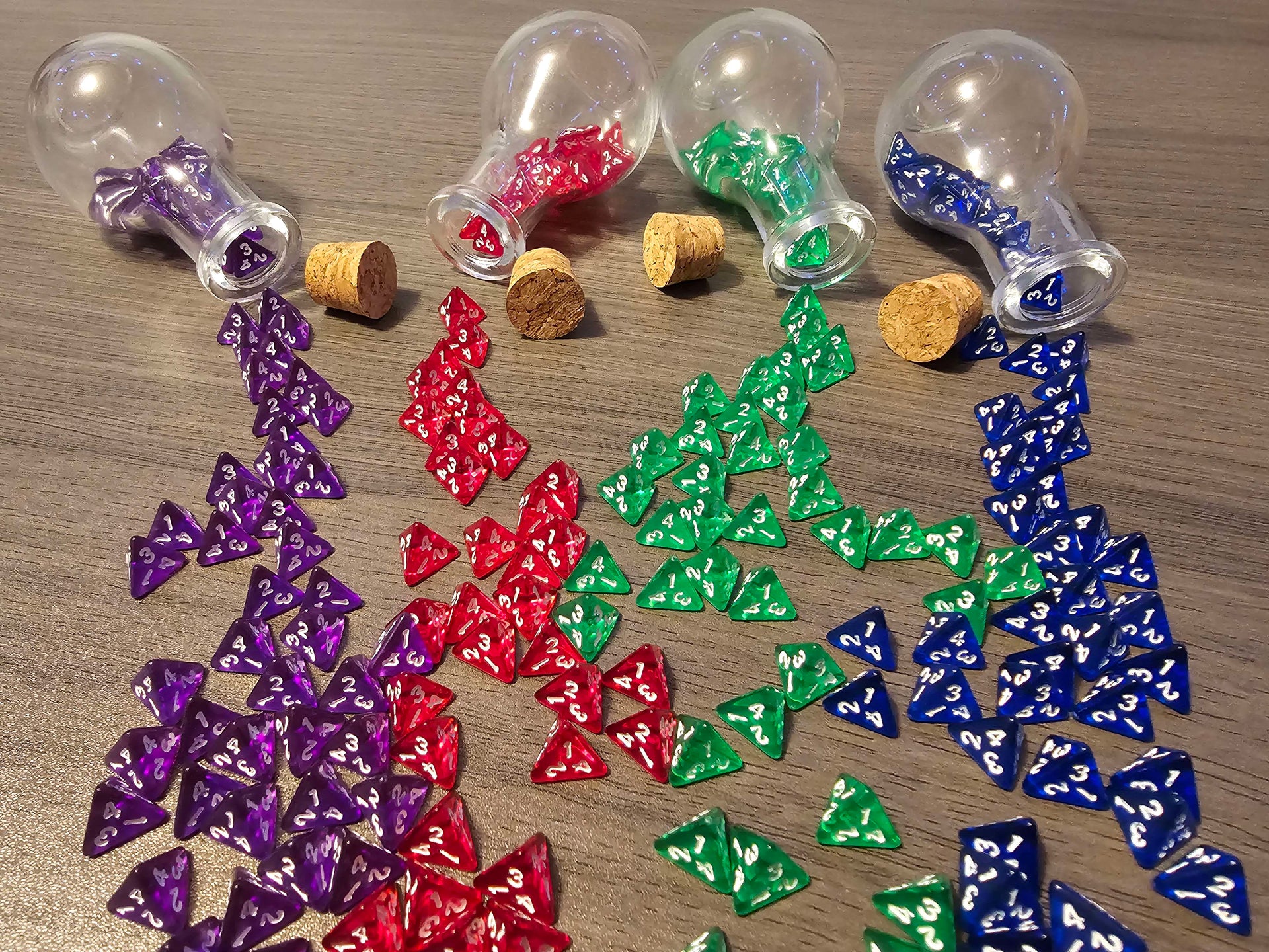 A set of 24 of our Mini D4 dice. Enough to complete an entire set of Healing Potions using your own bottles or vials, compatible with 5th Edition. These dice are quite small, measuring just under 10mm tall when sitting flat (roughly 12mm point to point). The second photo compares our mini D4 to a standard sized D4.