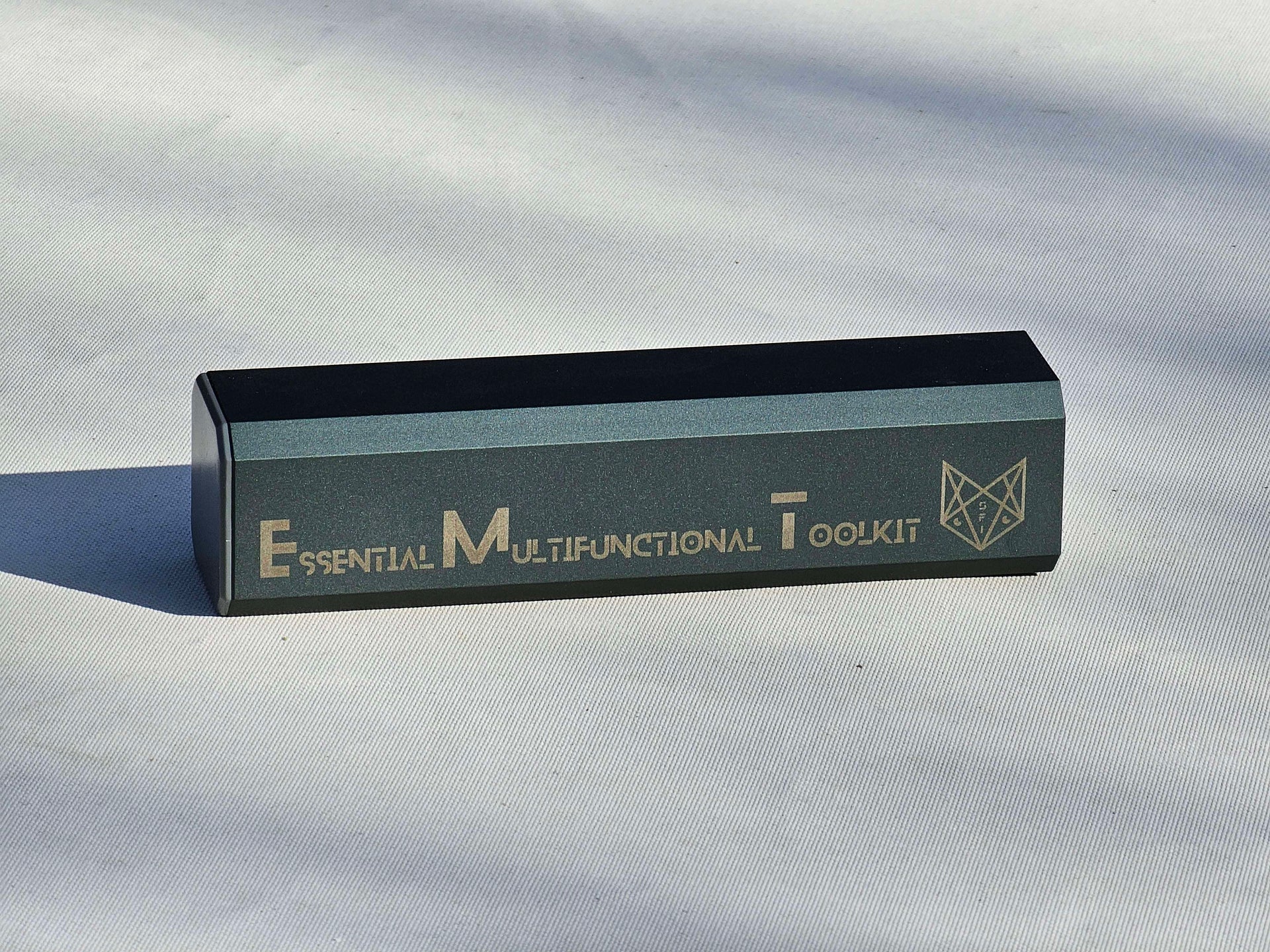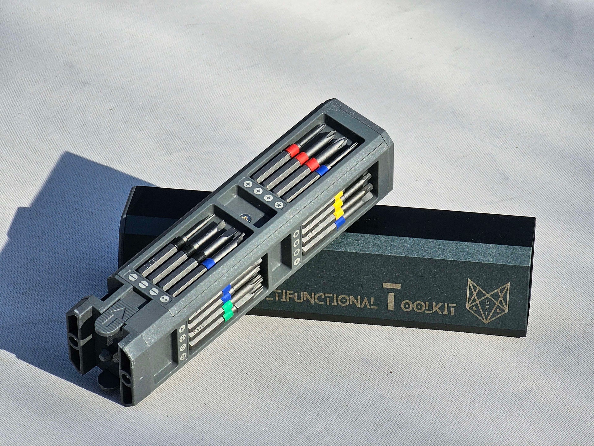 This is a 31 piece tool kit that includes bits, a screwdriver, tweezer, and a pry bar. The logo on it has been lasered engrave inhouse. Which means we can add personal additional lasering to it.