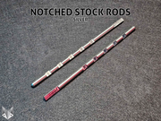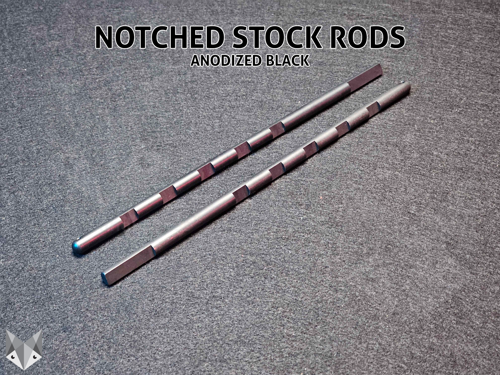Two metal rods with notches for extendable stock designs. Each rod also has a drilled and tapped (M3) hole at the rounded end so that you can add an M3 screw to prevent accidental removal from the blaster once installed.