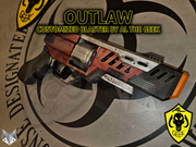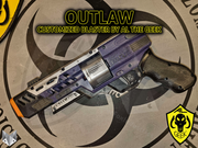 This is a custom painted Dart Zone outlaw blaster. It comes with a 3d printed front end that was made by XFOX games. The blaster comes with darts, 2 cylinders and instructions. It has a metal hammer prime that boasts 140 fps. It is available in multiple colors and is detailed in a post-apocalyptic theme that is great for cosplay or finishing your costume. The blaster is then finished with 3 coats of clear to make a durable finish.